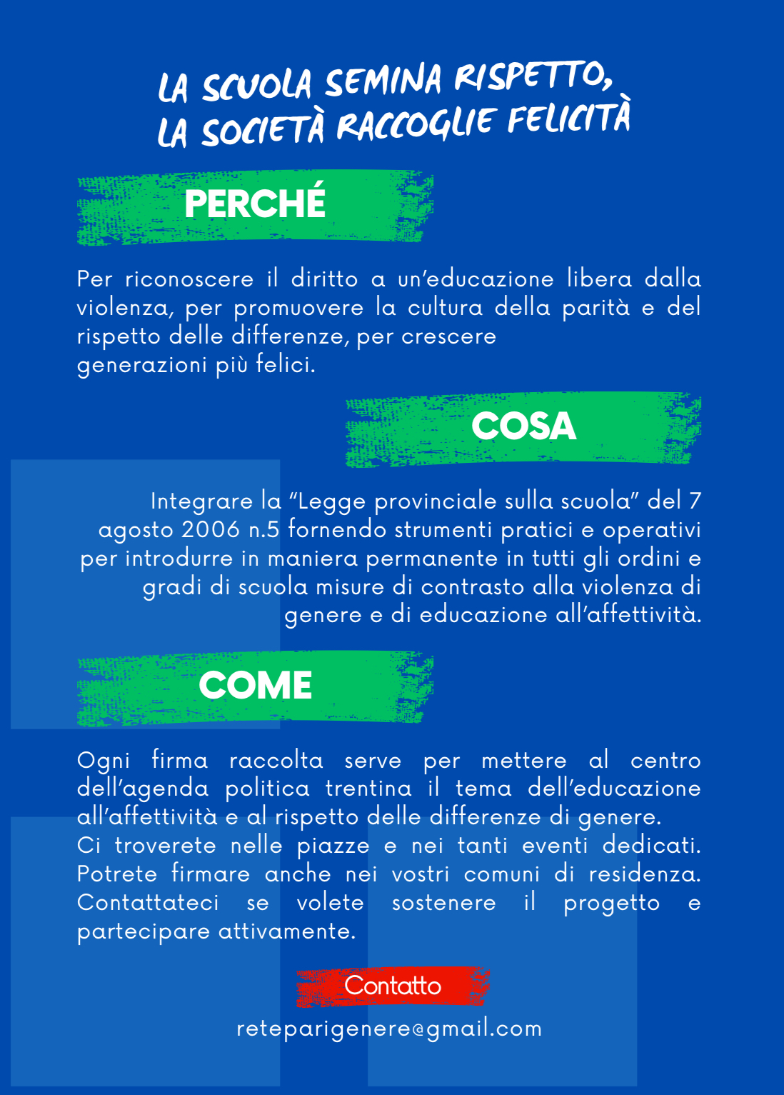 In Italia sosteniamo la raccolta firme della società civile trentina che chiede il ripristino di percorsi scolastici dedicati alla parità di genere. Un passo essenziale per prevenire stereotipi e violenza fin dall’adolescenza.