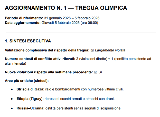 La tregua viene monitorata – a partire dal 30 gennaio – grazie alla collaborazione con l’Atlante delle guerre del Mondo, che ogni venerdì pubblicherà un report sul sito www. unimondo.org. Il primo report è uscito il 6 febbraio,  giorno dell’inaugurazione dei Giochi, al termine della prima settimana di tregua olimpica.