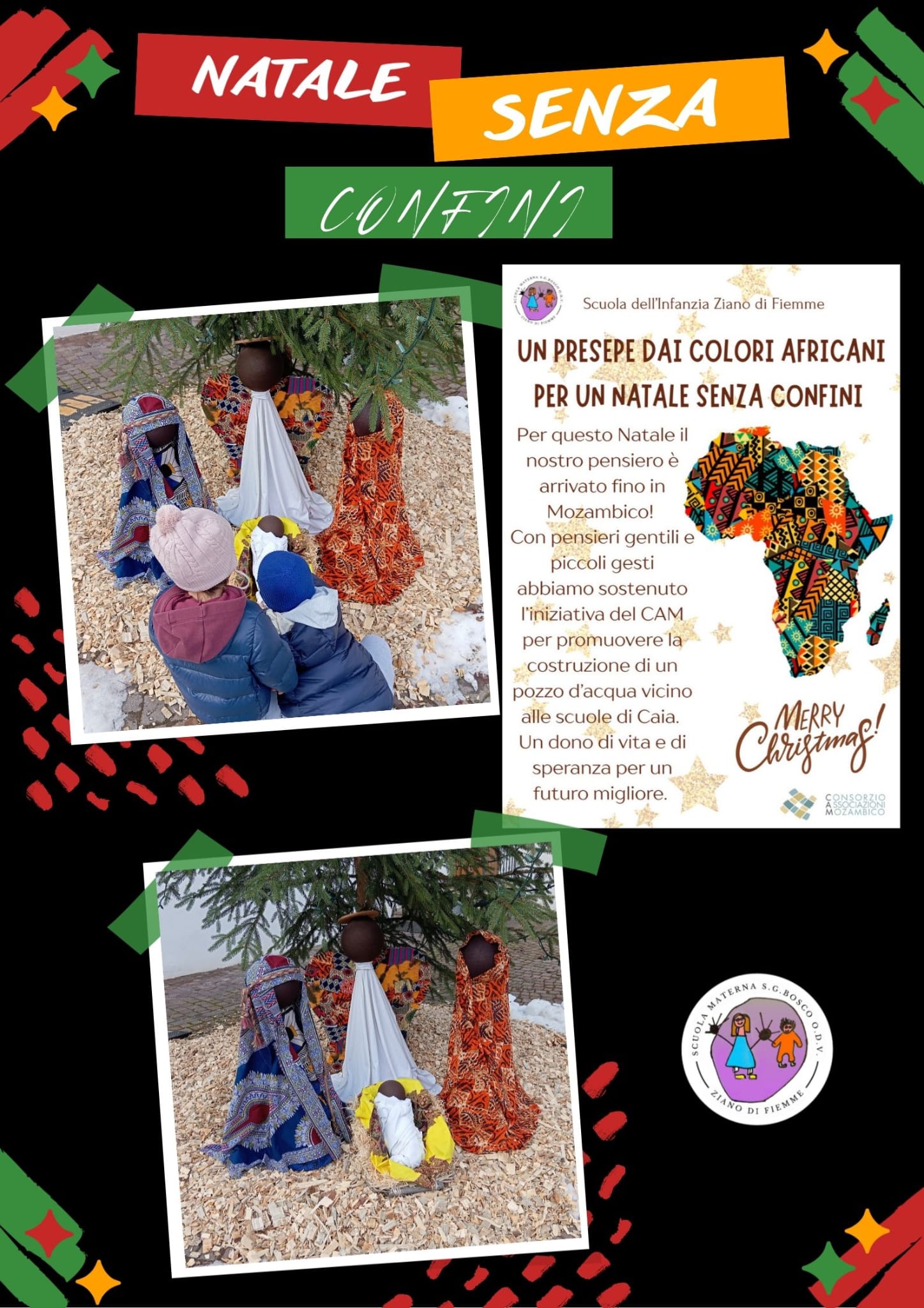 Protagonisti della coinvolgente esperienza sono stati i bambini, gli educatori e le numerose famiglie legate alla Scuola dell’Infanzia di Ziano di Fiemme. Qui è stato realizzato un presepe africano, colorato dalle stoffe giunte dal lontano continente ed inserito nel percorso offerto dal Comune a turisti e cittadinanza: “I presepi nel bosco”. Lo stesso spirito ha animato la realizzazione del Calendario 2026, che ha promosso un incontro tra culture ed unito conoscenza reciproca e creatività, convogliate in strumento concreto di sostegno al Progetto escolinhas del CAM.