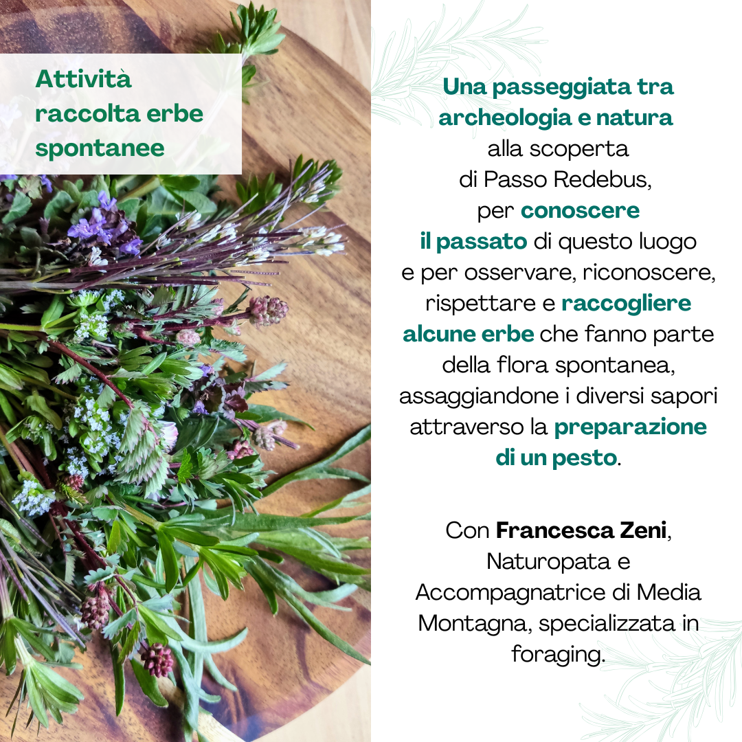 Una passeggiata tra archeologia e natura alla scoperta di Passo Redebus, per conoscere il passato di questo luogo e per osservare, riconoscere, rispettare e raccogliere alcune erbe che fanno parte della flora spontanea, assaggiandone i diversi sapori attraverso la preparazione di un pesto.