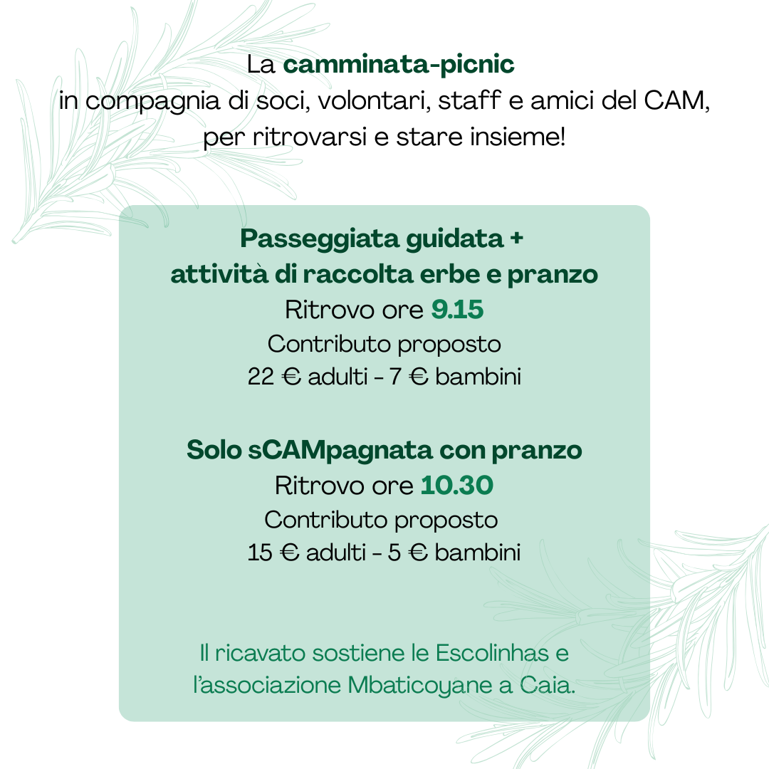 E’ giunta ormai alla quinta edizione la sCAMpagnata, una camminata-picnic in compagnia di soci, volontari, staff e amici del CAM, per ritrovarsi e stare insieme.
