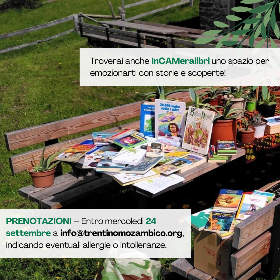 PRENOTAZIONIEntro mercoledì 24 settembre scrivendoci all’indirizzo email info@trentinomozambico.org specificando eventuali allergie o intolleranze alimentari.
